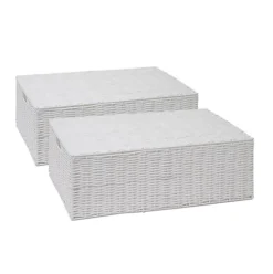 - WHITE WOVEN BASKET WITH HANDLES: This extremely durable set of two woven storage boxes has insert handles on the side.