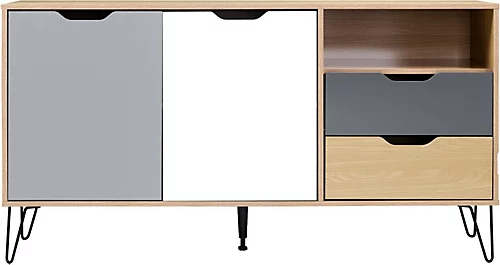 Bergen 2 Door 2 Drawer Sideboard Oak Effect White Grey Bring upscaled stylish elegance into your home with a palette of pale neutrals, natural materials and simple but beautifully made furniture. In Scandinavian styled furniture a repetitive colour palette of whites, beige, cool blues and soft grey is used to excellent effect, darker, earthy shades of charcoal, brown, navy and black can be used sparingly as accents colours for furniture and accessories, providing light and shade and creating visual interest and impact. Pure and functional but with natural elements adding warmth, its no wonder that Scandi styling never seems to go out of fashion, this coupled with the highly popular tread of reworking and upscaling, contrasting colour features and styles, just look at the combi-styled handles for instance, provide the best of both worlds and a truly inspired choice for your room. Dimensions Approximately Assembled Sizes W x D x H(MM) 1400 x 395 x 740 Extra Information Internal Drawer Space W425 D350 H105mm Drawer Front Size W475 H180mm Right Shelf Space W480 D370 H170mm Cupboard Shelf Space W870 D370 H170mm Door Size W430 H540mm Cupboard Opening Width 835mm Cupboard Opening Height 550mm Feet Size W100>30 H155mm Anti-tip Strap Included This range comes flat-packed for easy home assembly. Instructions and fixing kits included.
