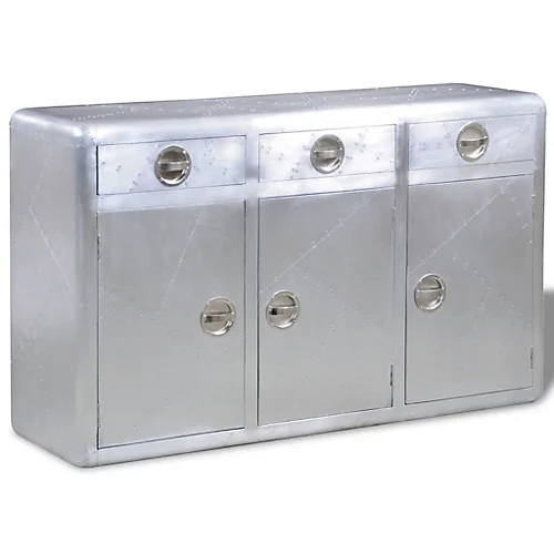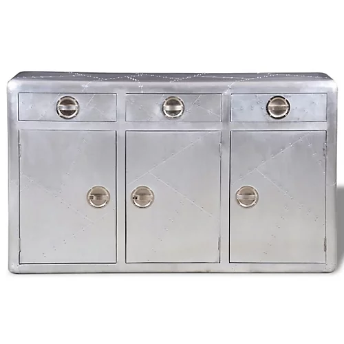 This high-quality aviator sideboard can be placed in any room. Thanks to its sleek and compact design, it can also be used as a coffee table, a bedside table, an end table, etc. This aircraft sideboard has 3 drawers for small items like keys, notepads, pens, and other knick-knacks; and 3 cabinets gives you ample extra storage space. The top can be used to place food or drinks or to display decorative objects like photo frames or potted plants. This aviator sideboard is made of solid wood and its surface is clad in a patchwork of polished aluminium panels, accented with exposed steel screws, which makes it extremely durable. Its smooth edges and retro handles give it a unique look.