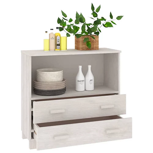 This wooden sideboard makes a decorative and practical addition to your decor. This drawer cabinet is made of solid pinewood, making it stable and sturdy. The highboard has 1 compartment and 2 drawers, providing ample storage space for keeping your various daily essentials well organised and within easy reach. Additionally, the sturdy tabletop is perfect for displaying decorative objects, photo frames, and potted plants.