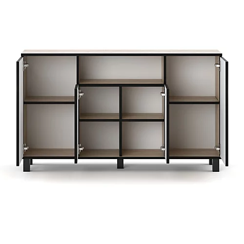 Fashionable design and functionality of the furniture. Perfect for the living room or corridor. Cabinet divided into parts equipped with hinged doors.
