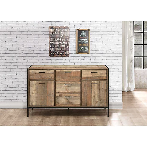 Our Urban range is perfect for adding a hint of industrial chic to any living room. The Urban large sideboard features 7 compartment areas making it ideal for both small and large items. The sideboard boasts 5 drawers and 2 large doors. This versatile range is crafted from a metal frame with industrial-effect detail and has a wood-effect finish. Care instructions: Wipe carefully with a soft, dry cloth.