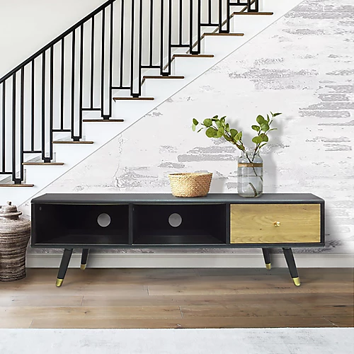 This stunning black and oak TV Unit would be the perfect addition to any living space, with a width of 140cm, this stand can accommodate for TVs up to 55”. Additionally, with three different storage areas and cable management features, this TV unit offers more than just a home for a big screen, but also will be the practical addition to the home.