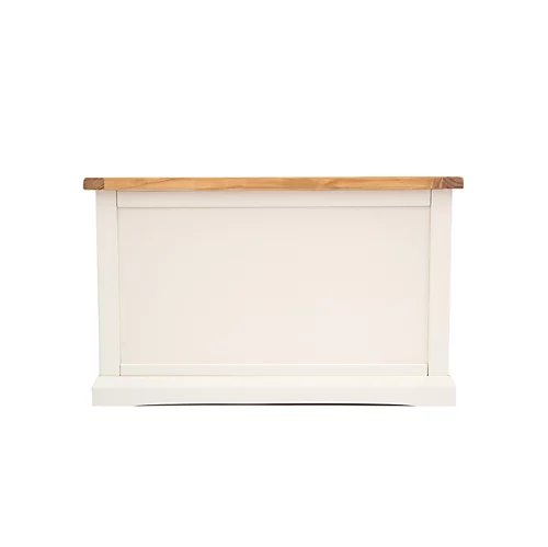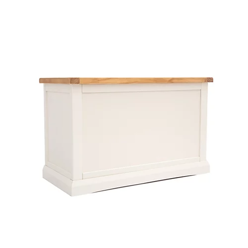 Our Castelli collection has a simple but pleasing design and is produced by our skilled craftsmen to the highest standards using responsibly sourced wood and veneers. All tops are made using a combination of solid pine wood and veneers and are carefully hand waxed giving it a great look. The body is finished with a high quality eco friendly water base paint on an off-white colour. This ottoman is the perfect item to fit in small areas, but still offers plenty of storage space for all your essentials. It comes with a safety holder to avoid accidents and it is made with a solid wood frame and veneer panels, making it very strong and stable, guaranteeing it will last for a long time. The top has a 3cm thick solid wood frame, making it extremely sturdy.These attributes combined with a simple construction for easy assembly makes it a great value product to be taken home today.