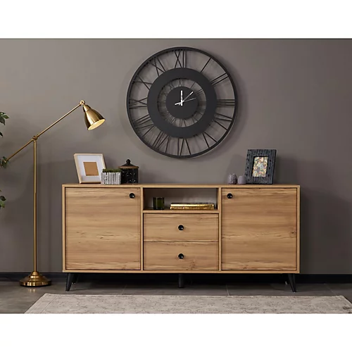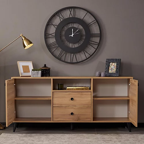 This natural sideboard has a stylish and functional design. It has 2 doors, 1 open shelf and 2 drawers that offer ample amount of storage space for your needs. It has two drawers and five compartments, thereby providing plenty of storage space