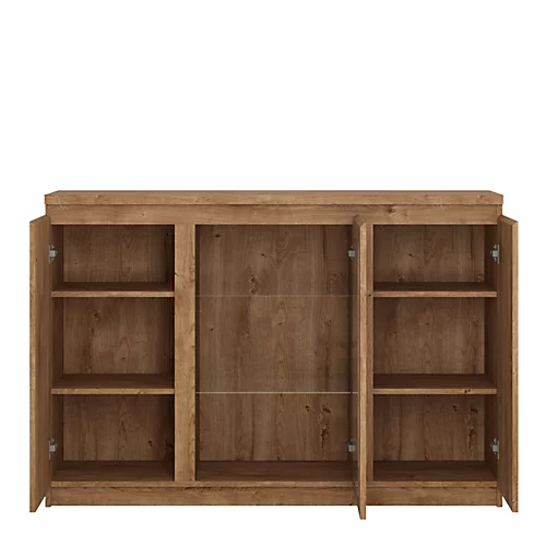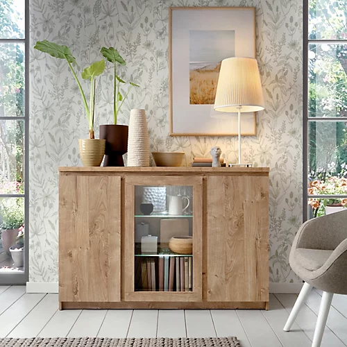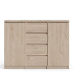 The original chest of drawers with a glass front with a geometric shape is a nod to elegance combined with modernity, as well as a lot of practical solutions. The glazed front of the chest of drawers is made of tempered safety glass . And the shelves behind the glass front can be additionally illuminated by purchasing optional lighting , thus allowing yourself to relax in the evening in a beautiful environment. The chest of drawers from the Fribo collection has been equipped with a modern handle-free system. The furniture is made of laminated chipboard, resistant to moisture, scratches, damage and high temperature. The program is available in two colour versions: Alpine White and Golden Ribbeck Oak.