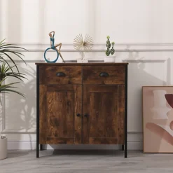 - Constructed with the black steel frame and rustic brown particleboard, this industrial-style storage cabinet fits snugly your living room, hallway, or bedroom