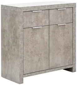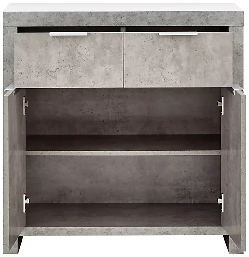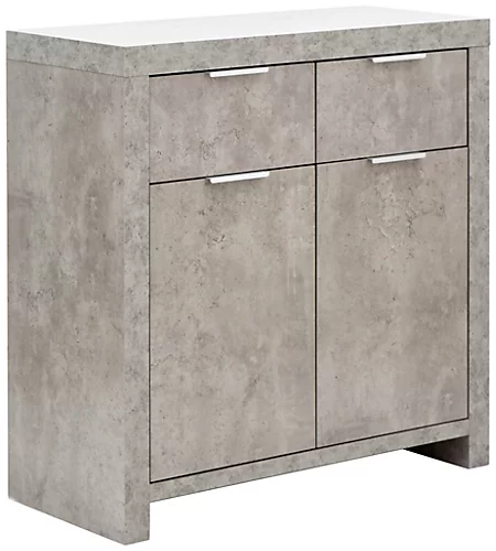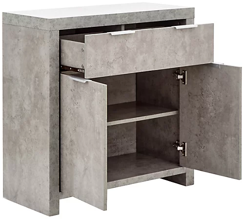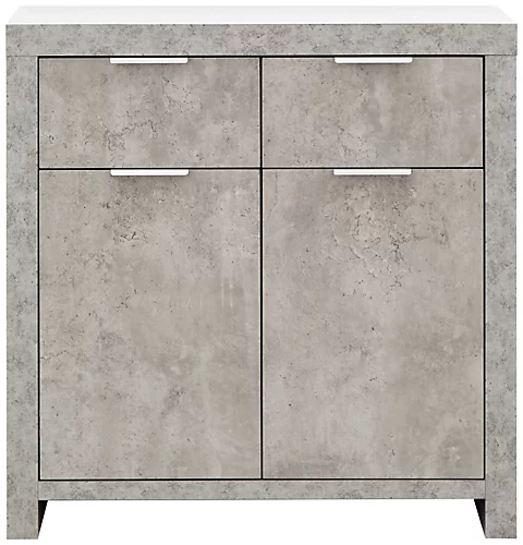 With Bloc, you don’t have to choose between form and function. The sleek and stylish design pairs clean lines with chunky panel construction to provide a compact storage option that helps keep your home clutter free. Finished in distressed concrete-effect melamine, it offers plenty of space for equipment and accessories. The two-door cabinet incorporates an adjustable shelf and is topped by matching twin drawers with slender finger plates that add to the urban-industrial appeal.