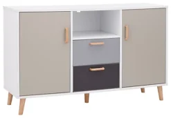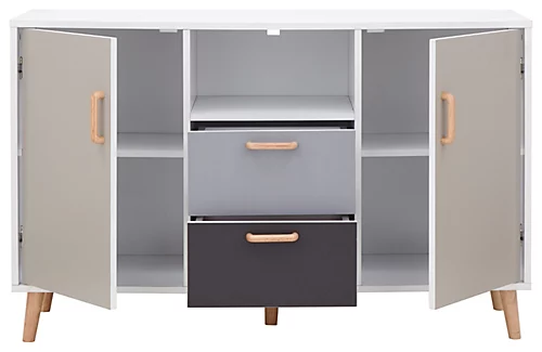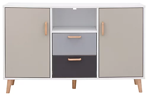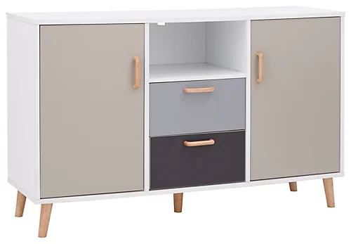 For many, a sideboard is a furnishing essential. Whether used to accommodate traditional dining accessories or pressed into service as a repository for home office essentials, this Delta sideboard is no shrinking violet. The clean lines of the frame, with its pristine white finish, acts as a foil for the striking assembly of front panels in a range of monochrome shades. The symmetrical form incorporates a central column of drawers beneath an open shelving space, flanked by a pair of cupboard doors to either side. The Modernist look is accentuated with Scandi-inspired solid wood handles and legs.