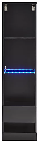If you have well-thought-out storage, you’ll automatically reduce clutter in your living space. These slender wall-mounted units are a great choice for the smaller home, offering four separate shelf cubbies in a tall form that allows you to store and display your precious items without taking up floorspace. Three open shelves are set above a lower, partially enclosed shelf with lift-up door – all benefiting from a sleek, monochrome finish and high gloss feature front panels. Featuring blue battery-powered LED downlighting for added impact.
