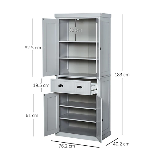 This HOMCOM tall storage cabinet is an ideal solution for any kitchen, made from MDF with reinforced backboards it is ideal for storing all your kitchen items like accessories and utensils. This tall cabinet comes with two cabinets with a drawer in the middle. The cupboard has 4 doors with 3 adjustable shelves for you to position as required. The door handles and knobs are having a brushed nickel finish giving the unit elegance and style. This is a great unit to have to match any room décor.