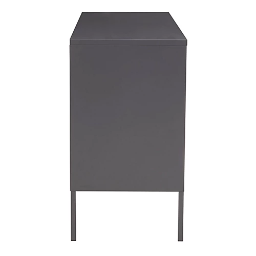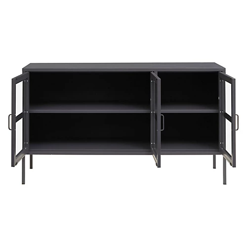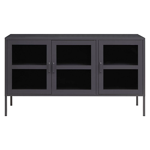 This sideboard has three glass doors revealing adjustable inner shelves for storing or decorative items. The sturdy grey powder coated metal design with matching handles and sleek legs creates a simple and streamlined classic aesthetic.