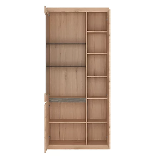 Tall 3 door display cabinet in Oak. This fantastic grained oak finish with the contrasting dark trim makes this modern top quality collection of living room furniture the ideal destination for the most modern or traditional homes.