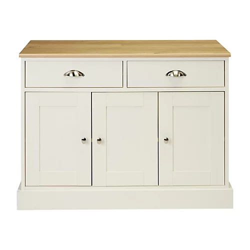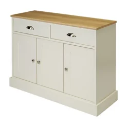 This stylish and functional sideboard, painted in warm white and finished with a oak effect top, features 3 cupboards and 2 drawers.