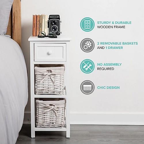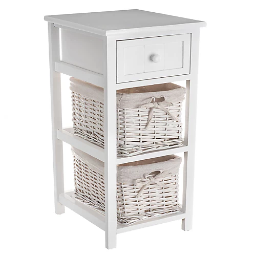 - FEATURES – Compliments with any style of furniture. Features one drawer and one wicker basket. White Finish, Material: MDF, Pinewood, wicker basket. A Stylish Storage Solution with a crisp and fresh look and feel. These cabinets will add beauty to your home. Ideal for use in any room; would make a lovely bedside lamp table.