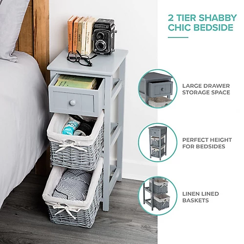 - FULLY ASSEMBLED – Bedside Cabinet comes with full assembled. Stylish compact bedside table with shabby chic design. A beautiful white bedside table that has 1 drawer and 1 wicker basket for storage. Perfect for bedrooms with limited space.