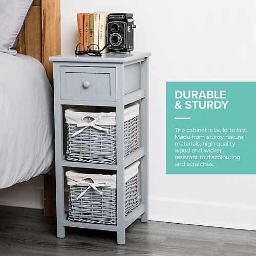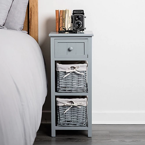 - FEATURES – Compliments with any style of furniture. Features one drawer and one wicker basket. White Finish, Material: MDF, Pinewood, wicker basket. A Stylish Storage Solution with a crisp and fresh look and feel. These cabinets will add beauty to your home. Ideal for use in any room; would make a lovely bedside lamp table.