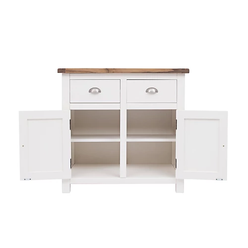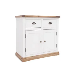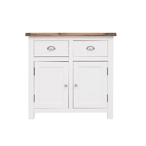 Our Lovere collection has a simple but pleasing design and is produced by our skilled craftsmen to the highest standards using responsibly sourced wood and veneers. All tops are made using a combination of hardwood and ash veneer and are carefully hand waxed giving it a great look. The body is finished with a high quality eco friendly water base paint on an off-white colour. A compact 2 door 2 drawer sideboard ideal for your kitchen, dining room or lounge. The two doors conceal a large cupboard space for storing crockery, bottles or glassware and there is a shelf to help you organise your contents too. Above this there are two drawers for cutlery, napkins, place mats or maybe even keeping essential paperwork to hand. These attributes combined with a simple construction for easy assembly makes it a great value product to be taken home today.