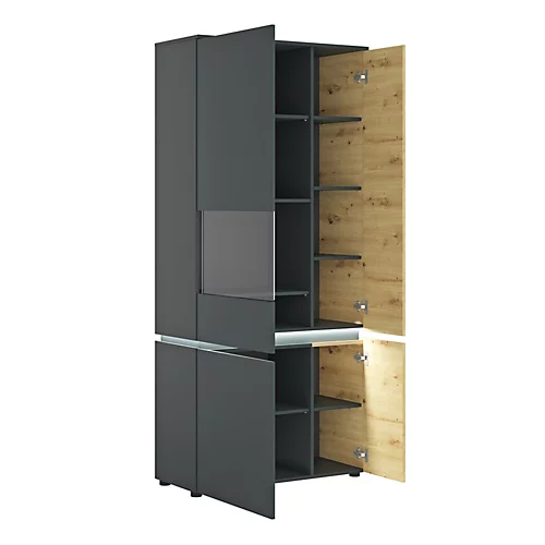 A high display window is a piece of furniture for people who value functionality combined with an interesting design. The interior of the site hides a lot of storage space, as well as a space behind the glass, where you can display interesting accessories and beautifully highlight them with optional lighting (sold separately). The furniture uses an ergonomic handle-free solution , accessories with a soft close and tempered glass , which allows for safe use of the furniture.