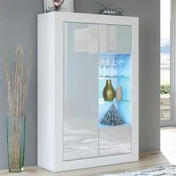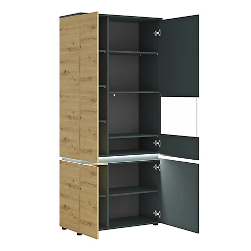A tall display cabinet with glazing in a geometric shape and a modern combination of Artisan Oak and Gray Cosmos decor is a solution for people looking for a unique and timeless style. The inside of the site has a lot of storage space, as well as a space behind the glass, where you can display interesting accessories and additionally emphasize their charm with optional lighting (sold separately). The furniture uses an ergonomic handle-free solution , soft-close accessories and tempered glass. The big advantage of the display case from the Luci collection is the constructional lighting (sold together), which gives the block a unique, but very subtle look.