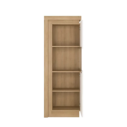 Narrow display cabinet (RHD) 164,1cm high (including LED lighting) in Riviera Oak/White High Gloss. Space saving narrow 164cm high display cabinet (right hand door opening) has smoky glazed area to display family treasures. Includes concealed lighting arrangement. A high quality collection in a ultra modern design – with each item complementing each other.