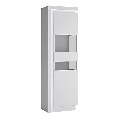 Tall Narrow display cabinet (RHD) 198cm high (including LED lighting) in White and Gloss White. This beautifully designed display cabinet (right hand door opening) has a clear glass centre to display your family treasures and is inclusive of a concealed lighting fixture. A must have for the dining or living room.
