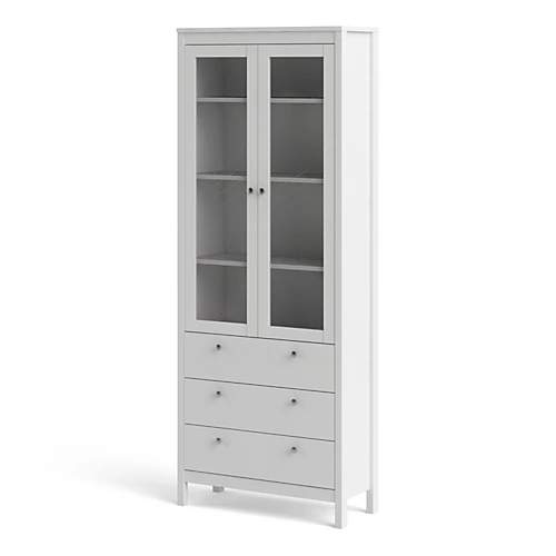 A contemporary glass display cabinet with two doors and three drawers in an elegant design complete with a simple plastic handle, also available in contrasting matt black.