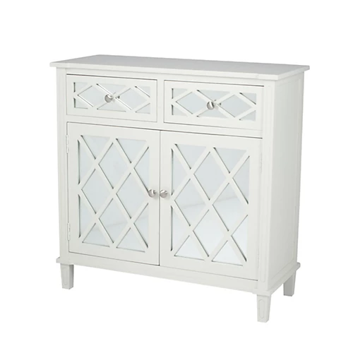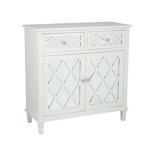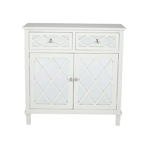 Add a touch of elegance to your home with this smart two door unit. Finished in soft pine wood and featuring two pretty mirrored drawers and two cabinet doors, which both have a delicate wood pattern overlay and metal handles. A design that will stand the test of time and become a staple of your home for years to come.