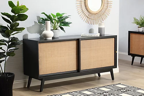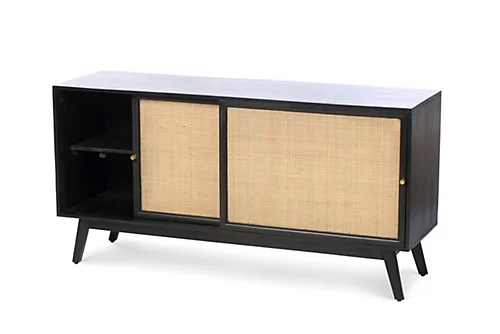 Create an exquisite space using the Manhattan Sliding 2 Door Sideboard Rattan Cabinet in Black. A handmade sustainable solid wood credenza with natural rattan front panels and gold handle detailing. Perfect for in the hallway or living room. Seamlessly compliments other pieces in our Manhattan collection, the long wooden cabinet can be styled with other trendy furnishings for a modern look or even vintage items for a more retro style.