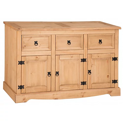 Mercers Furniture is happy to offer this Corona 3 Door 3 Drawer Sideboard, expertly crafted from solid pine and hand waxed to preserve as well as enhance the grain. With 3 doors and 3 drawers it offers outstanding value for money that would be a welcome addition to any home. The item is finished off with black metal fittings which give the dining set its distinctive Mexican styling and offers that warm rustic country charm. The item has hardboard backs, hardboard drawer bases and is delivered flat packed for easy home assembly with step-by-step instructions.
