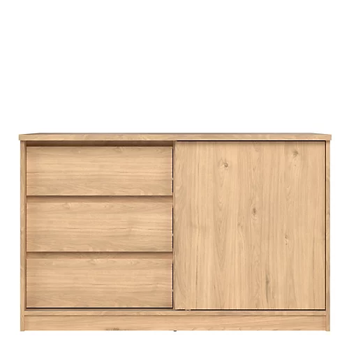 The Naia collection offers a tribute to timeless furniture. The storage unit has 3 drawers 1 shelve and a sliding door. Also available in White High Gloss.