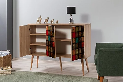 This sideboard has an elegant and functional design. It has 3 doors and 5 shelves that offer ample amount of storage space for your needs.The doors have a forest-themed design made using ultraviolet digital printing technique. This technique increases the durability of the pattern against scratches and fading.