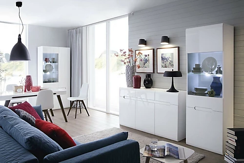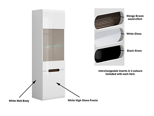 AZTECA T furniture range offers a part glazed single door Display cabinet with glass shelves inside and LED display lighting included. Unit comes with White Gloss front, White Matt Body and choice of Wenge, White Gloss and Black Gloss Inserts.