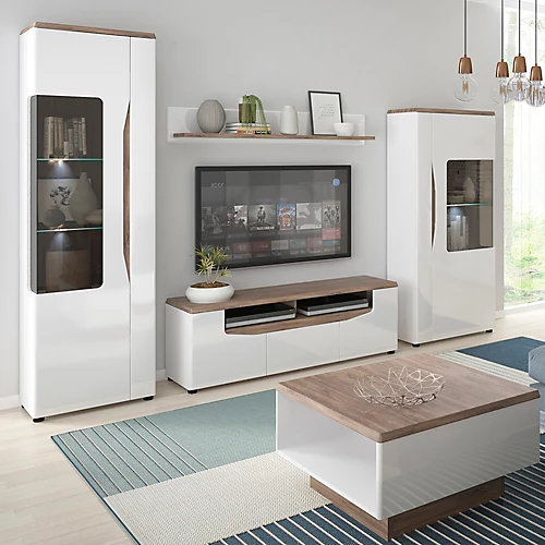 1 door display cabinet (LH) in Alpine White with high gloss fronts and Stirling Oak. Great display unit with plenty of room for storage – both displayed and hidden away. This great collection is perfect for lovers of bright and moderne interiors, striking and sophisticated.