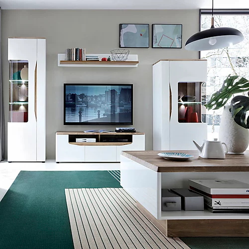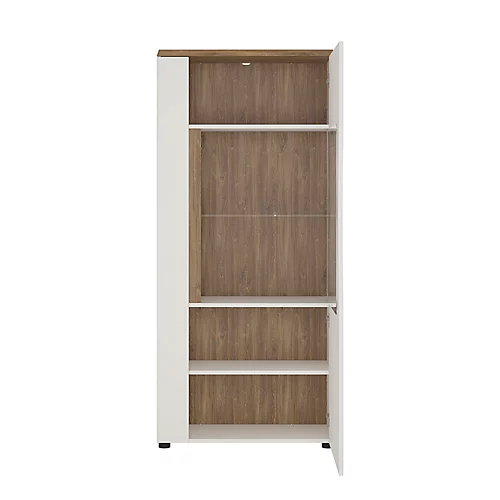 1 door low display cabinet (RH) in Alpine White with high gloss fronts and Stirling Oak. Great low display unit with plenty of room for storage – both displayed and hidden away. This great collection is perfect for lovers of bright and moderne interiors, striking and sophisticated.