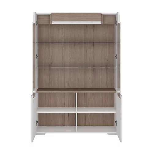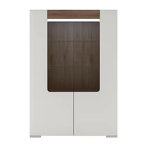 Low Glazed 2 Door Display cabinet with internal shelves, High Gloss with San Remo Oak inset (inc. Plexi Lighting). A delightful low glazed display cabinet that has many features including soft close doors, internal LED lighting and adjustable shelves. Warm and yet cool living and dining collection in white High Gloss with San Remo Oak inset.