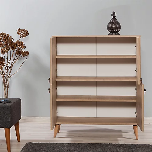 - The sideboard is made of high-quality melamine faced chipboard finished in oak wood-look and the painting on the doors are made using ultraviolet digital printing technique. It features a round tapered shape prime quality solid wood legs. Manufactured in Turkey.