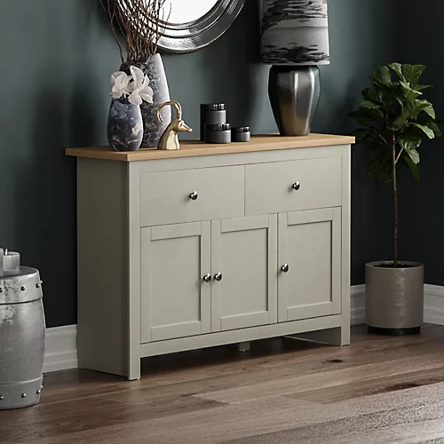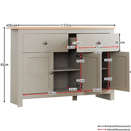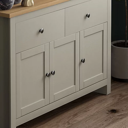 - Elegant Colour Combination: The mid-tone grey finish of the sideboard is complemented by a contrasting oak effect table top, creating a visually appealing and stylish look. The combination of these colours adds a contemporary twist to traditional settings, making it a versatile piece that can seamlessly blend into various interior styles.