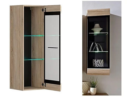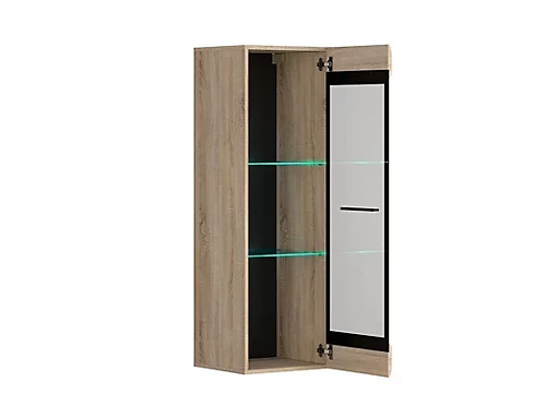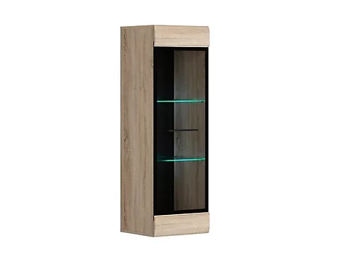 Modern design with black straight handle and high quality Sonoma Oak wood effect textured finish that gives a realistic appearance of wood. Safety glass door and internal shelves which include mains-powered clip on LED Lighting.